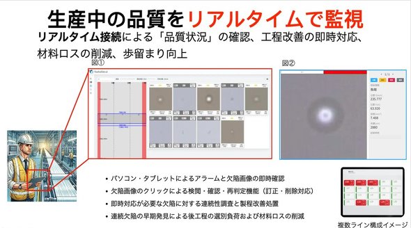 導入効果として、検出率向上と目視負荷の低減、属人性排除、不良の集中箇所の即時可視化、材料ロスと歩留まりの改善を掲げる。