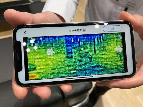 住宅用IoTソリューションコーナーでは、MyMUと家電をつないで体験できる幾つかのブースが用意されていた。「IoTのあるくらし」ブースでは、三菱電機エアコンに搭載されているサーモパイルセンサー「ムーブアイ」とMyMUを活用した体験ができた。MyMUでムーブアイによる部屋の熱画像を確認した上で、部屋内の温度を下げたい箇所に冷風を送れるようにエアコンのフラップを操作することができる。