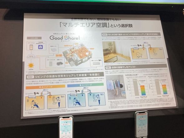 「空気のおすそわけ」ブースでは、「Good Share!(グッシェア)」システムの体験展示があった。「エアコンのない部屋との温度差による不快感」を解決するために開発されたグッシェアは、エアコンを設置しているリビングルームからエアコンのない部屋にダクトを伸ばして空気を送ることで温度差を解消できることが特徴で、2024年度省エネ大賞(資源エネルギー庁長官賞)を受賞した。