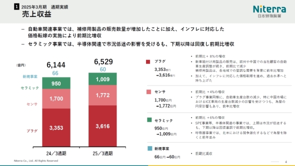 日本特殊陶業の2024年度連結業績の売上高は6529億円。セグメント別ではプラグが3616億円、センサーが1772億円を稼ぎ出している。今回買収した事業は、スパークプラグ事業がプラグに、排気センサーがセンサーに組み込まれることになる。また、今回の買収金額である1806億円は年間売上高の3割弱に当たり、同社にとって大型買収となる。