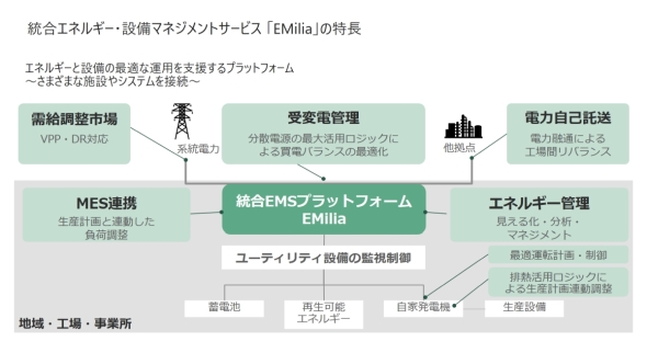 一方の課題である「エネルギーの最適利用」に貢献してきたのが、統合エネルギー・設備マネジメントサービス「EMilia」だ。工場内のさまざまな施設やシステムを接続し、エネルギーと設備の最適な運用を支援するプラットフォームを提供する。