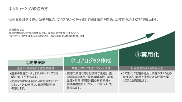 「第1ステップとして過去の生産データとエネルギーデータから相関関係や因果関係を分析し、効果検証します。その結果、投資対効果が高いと判断されたなら、第2ステップとして実際の業務に即した詳細な生産計画ならびに利用エネルギーの制約条件/評価指標などヒアリングし、コアロジックを作成します。そして第3ステップとして、このコアロジックを組み込んだ計画立案システムを構築して実用化に向かいます」(正木氏)