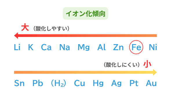 図4に、金属をイオン化傾向が大きい順に並べています。イオン化傾向が大きい金属ほど、酸化しやすい金属となります。これを見ると、鉄は銅よりもイオン化傾向が大きく、アルミニウムよりもイオン化傾向が小さいことが分かります。つまり、鉄は銅よりも酸化しやすく、アルミニウムよりは酸化しづらい金属となります。