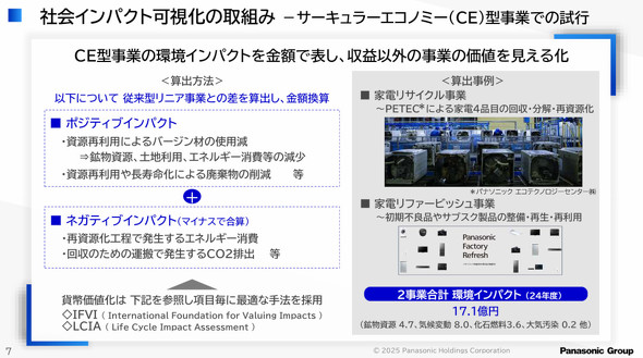考え方としては、従来型の事業と、サーキュラーエコノミー型事業を比較し、資源再利用によるバージン材の使用や廃棄物の削減などのポジティブな効果を算定し、そこから再資源化によるエネルギー消費の増加や、資源回収によるCO2排出量の増加などを引いて算出する。例えば、パナソニック エコテクノロジーセンターによる家電リサイクル事業と、家電リファービッシュ事業を合わせた環境インパクトとしては17.1億円があったとする。