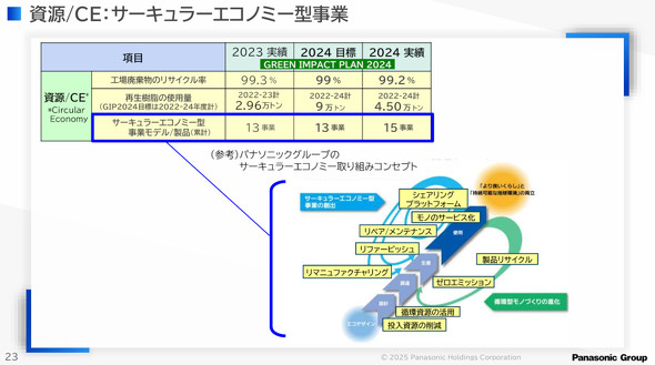 サーキュラーエコノミー型事業は、目標通り増やすことができているが、パナソニックHD サステナビリティ経営強化プロジェクト リーダーの奥長秀介氏は「ビジネス面で考えると初期に収益を生み出すことが難しい。費用対効果を考えると進められなくなる」と課題について語る。