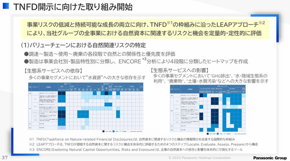 パナソニックHDでは、LEAP(Locate、Evaluate、Assess、Prepare)アプローチにより、グループ全事業における自然資本に関連するリスクと機会を定量的、定性的に評価し、まずヒートマップで見える化した。その結果「多くの事業セグメントで水資源への依存度が高いことが分かった。製造工程も組み立て型が中心で資源を大量に使うビジネスモデルではないが、サーキュラーエコノミーと関連させながら、どのように示していくか検討する」と奥長氏は語っている。