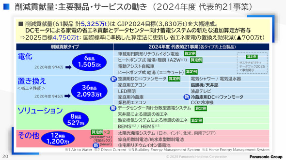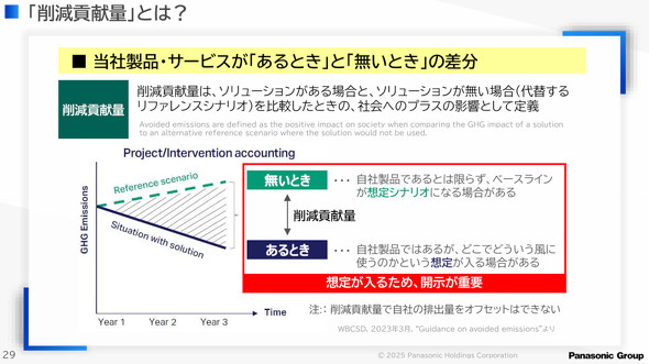 さらに、2024年度に一定の成果を残したのが「削減貢献量」の浸透に向けた取り組みだ。削減貢献量とは、パナソニックグループの製品やサービスが「ある場合」と「ない場合」を比較したときに、社会への影響の差異がどれくらいあるかを推計するものだ。「想定」が入るために基準に振れ幅があり、定義をどうするかで国際的に議論が進められている。ただ、企業にとっては省エネを含む環境に良い製品やサービスを生み出す動機になるため、パナソニックHDを含め複数の日本企業が積極的に標準化を推進している。