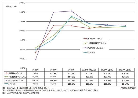 2024〜2025年の同市場は、コロナ禍でのICT関連製品向け特需からの反動で低減したが、その後の回復フェーズを経て、実際の需要に即した動きをするようになった。2024年のメーカー出荷数量をベースとした主な高機能フィルムの成長率は、光学用PETフィルムが105.2%、一般産業用PETフィルムが114.6%、MLCCリリースフィルムが121.1%、PIフィルムは115.5%だった。同社は同市場の今後の成長率について、いずれのフィルムも2025年は前年比103〜108%ほどとなり、2026年から2027年も年に1桁ペースで緩やかに成長すると予測する。