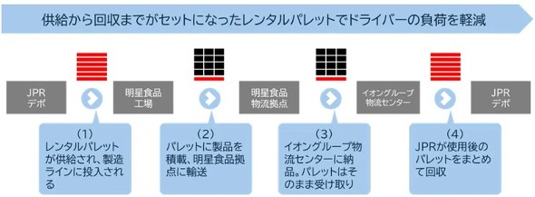 今回の取り組みでは、まずJPRが明星食品にレンタルパレットを供給する。明星食品では、レンタルパレットを製造ラインに投入し、トップバリュの即席めんをパレットに積載する。その後、明星食品の拠点へ輸送し保管し、レンタルパレットのままイオングループの物流センターに納品する。使用後は、同センター内で他メーカーが使用した分のパレットも合わせて、JPRが回収する。