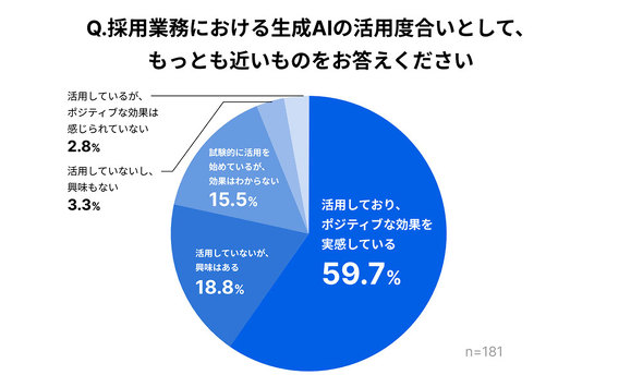 次に、採用業務における生成AIの活用度合いを尋ねたところ、「活用しており、ポジティブな効果を実感している」が59.7%、「試験的に活用を始めているが、効果はわからない」が15.5%、「活用しているが、ポジティブな効果は感じられていない」が2.8%となり、78.0%と全体の4分の3にのぼる企業で、採用業務での生成AI活用が進んでいることが分かった。