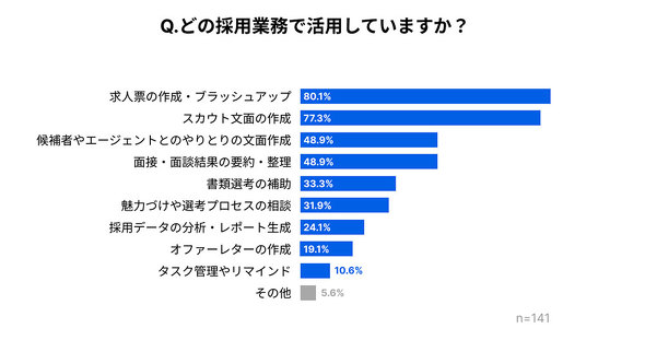 どの採用業務で生成AIを活用しているかについては、「求人票の作成、ブラッシュアップ」(80.1%)が最も多かった。次いで「スカウト文面の作成」(77.3%)、「候補者やエージェントとのやりとりの文面作成」「面接、面談結果の要約、整理」(同率48.9%)だった。