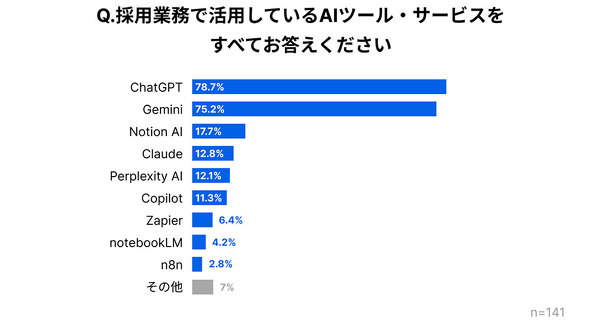 採用業務で活用しているAIツールやサービスのトップ3は、1位が「ChatGPT」(78.7%)、2位は「Gemini」(75.2%)、3位が「Notion AI」(17.7%)だった。