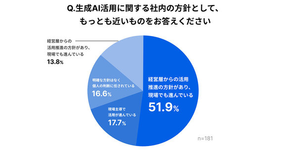 生成AI活用に関する社内方針を尋ねたところ、「経営層からの活用推進の方針があり、現場でも進んでいる」(51.9%)が最も多かった。