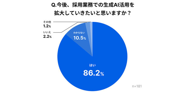 今後、採用業務での生成AI活用を拡大していきたいと思うかについては、86.2%が「はい(拡大したい)」と回答した。