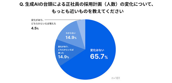 続いて、生成AIの台頭による正社員の採用計画(人数)の変化について尋ねた。その結果、65.7%が「変化はない」と回答した。