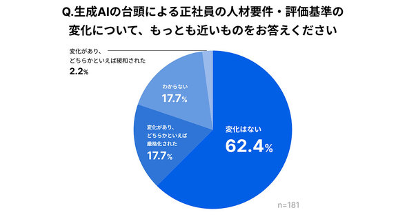 また、生成AIの台頭による正社員の人材要件、評価基準への変化を尋ねたところ、62.4%が「変化はない」と回答した。AI活用の推進が採用業務で進みつつも、現段階では採用人数や人材要件への影響は限定的と言えそうだ。