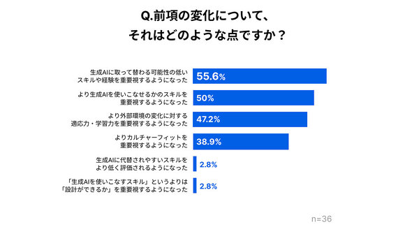 前問で、人材要件や評価基準に「変化があった」と回答した人に具体的な変化について尋ねた。最も多かった回答は「生成AIに取って替わる可能性の低いスキルや経験を重要視するようになった」(55.6%)だった。次いで、「より生成AIを使いこなせるかのスキルを重要視するようになった」(50.0%)となっている。