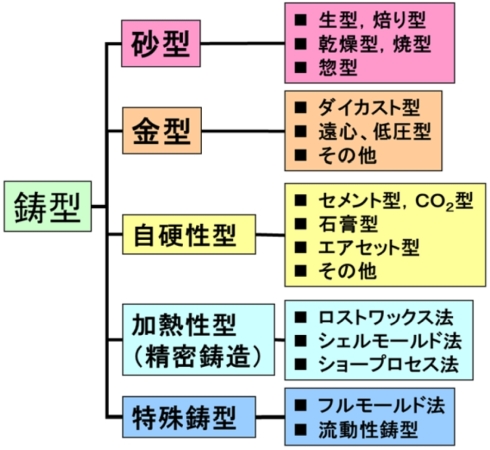先述したように、鋳造法は砂型、金型、ダイカスト、精密、遠心、低圧に分類される。この鋳造法における型は、一般的に鋳型と呼ばれる。