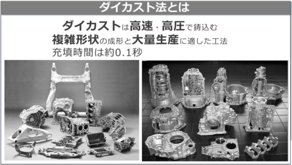 図5に示すように、ダイカスト法は精密金型鋳造法の一つで、金属製の鋳型に溶湯を高温にして、高速/高圧力によって流し込み、極めて複雑な形状ながら極めて鋳肌(製品品位)の良い鋳物を短時間で大量に生産できる。充填時間は約0.1秒と極めて短時間である。
