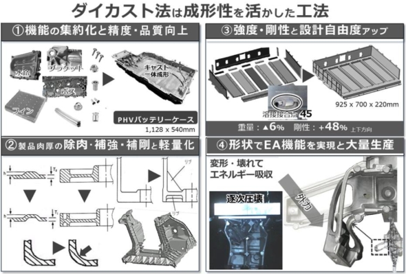 一方、デメリットとしては、ダイカスト鋳造するための機器などが大掛かりで手間が掛かる点が挙げられる。また、個々の部品の製造コストは低いものの、金型が高価であるため初期投資費用が高額になる。部品内部に巣(引け巣:微小な空洞のこと)が生じやすく、それが原因で部品の破断などにつながる恐れもある。このため、CAEやシミュレーションによる解析技術の活用が必須となる。