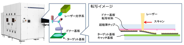 今回、東レエンジニアリングは、NEDOの助成事業「ポスト5G情報通信システム基盤強化研究開発事業」で、高精度レーザー加工位置制御技術と、レーザー転写プロセスに最適化したレーザー光学系を開発した。LEDをディスプレ基板に実装する際などに使用されるレーザー転写技術を応用したもので、東レエンジニアリングでは「スキャン方式」と呼んでいる。