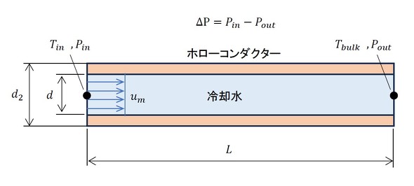図3に設計仕様を示します。コイルは直線状に伸ばし、その長さをLとします。入り口の流速をum、温度をTin、圧力をPinとし、出口の圧力をPoutとします。出口温度は混合平均温度Tbulkとなります。圧力損失ΔPは、入り口と出口の圧力差(Pin−Pout)で定義されます。