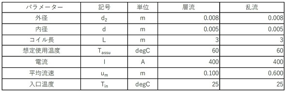 例えば、表1のような数値としましょう。400[A]という、とんでもない電流を流します。表に示す想定使用温度は、銅の比抵抗や水の物性値が温度によって変化するため、事前に温度を仮定しておく必要があります。実際に温度を求めた後、その値と想定使用温度を比較し、差が大きければ想定温度を見直して計算をやり直します。