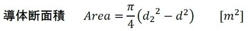 いよいよ設計計算Excelシートを作成します。ここでは、図2左側のホローコンダクターの場合を考えます。導体の断面積および体積は、次式で求めます。