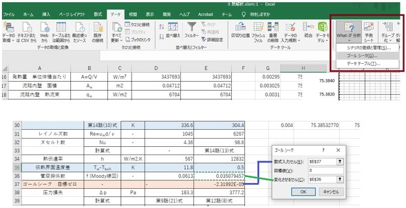 乱流時の圧力損失係数は、式17がゼロとなるよう、Excelのゴールシーク機能を使用して求めます。図5のようなイメージです。