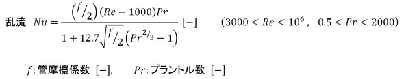 これは連載第12回で紹介した、Moody線図の滑らかな管の式です。筆者はホローコンダクターの圧力損失データを持ち合わせており、おおよそ滑らかな管の式でいいようです。