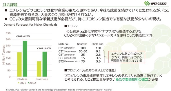 エチレンとプロピレンは化学産業で主たる原料として使われており、今後もこれらの市場は成長を続けていくとされている。しかし、化石資源由来の原料であるため、製造工程で大量のCO2が排出されることを避けられない。エチレンは、石油化学燃料(ナフサ)から製造するよりもCO2の排出量が少ないシェールガスを原料とした製造にシフトしている。しかしながら、プロピレンでは製造工程などで生じるCO2の排出量を減らす有望な技術が少ないのが現状だ。