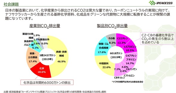 また、日本の製造業において、化学産業から排出されるCO2は多量だ。そのため、カーボンニュートラルの実現に向けて、ナフサクラッカーから生産される基幹化学原料や化成品を、環境に優しい代替物に転換することが求められている。