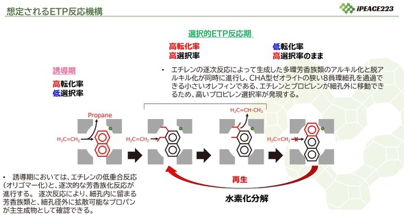 選択的ETP反応期は、エチレンの逐次反応によって生成した多環芳香族類のアルキル化と脱アルキル化が同時に進行し、チャバサイト型ゼオライトの狭い8員環細孔を通過できる小さいオレフィンである、エチレンとプロピレンが細孔外に移動可能なため、高いプロピレン選択率が発現する。iPEACE223 代表取締役 最高技術責任者(CTO)の瀬戸山亨氏は、「使用しているチャバサイト型ゼオライト触媒は0.38nmの微細な穴を有しているのが特徴だ。この穴がエチレンとプロピレンのみを通過させ、高選択的にプロピレンを生成する」と説明した。