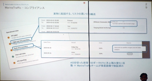 アンパージディス氏は「制裁回避の手口」について言及した。近年問題となっているのが、AIS信号を意図的に偽装する「スプーフィング」や、一定期間信号を停止して航跡を隠す「ダークアクティビティー」だ。これらの回避策によって船舶が制裁対象国の港に立ち寄った事実を隠蔽(いんぺい)しようとするケースが後を絶たないという。従来は事後的な調査でしか発覚しなかったこうした行為も、Marine Trafficのように膨大なAISデータを直接収集して解析する仕組みによって、リアルタイムに検出できるようになった。