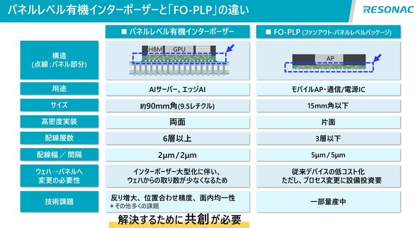 しかし、大型インターポーザーの製造には複数の課題がある。1つ目は、製造における「反り」の発生だ。従来のウエハーレベル(300mm)の製造では、ある程度均一性が保たれていたが、510m×515mmのパネルレベルに大型化すると、製造過程で反りが発生しやすくなる。この反りは、その後のさまざまな工程に影響を及ぼし、生産の安定性を損なう。