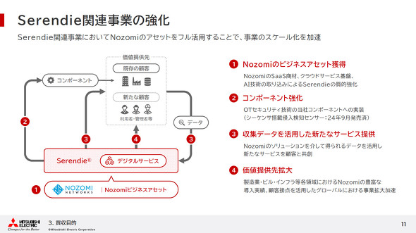 具体的には、Nozomi NetworksのSaaS商材やクラウドサービス基盤、AI技術を取り込んでSerendieの質的強化を図る。また、Nozomi Networksの技術を三菱電機の製品に実装する。これは既にPLC向け侵入検知センサーとして一部実現している。さらに収集データを活用した新たなサービスによって、製造業に加えビルやインフラなどへ価値提供先を拡大する。