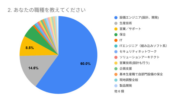 まず注目すべきは、回答者の多様性です。職種は設備設計や保全、生産技術といった制御の専門家だけでなく、ITエンジニアや営業、企画支援にまで及びます(図2)。これは、PLCがもはや一部の専門家だけのものではなく、モノづくりの多様な立場の人々が関わる「共通基盤」であることを示しているといえるでしょう。