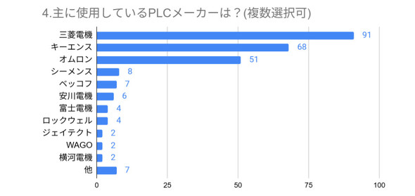 主に使用しているメーカー(図3)としては、三菱電機、キーエンス、オムロンの3社が突出して挙がりました。国内市場における、この3社の影響力の大きさを改めて示す結果となりました。