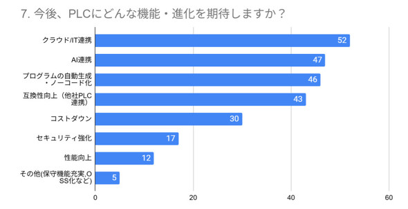 こうした根深い課題がありつつも、現場はPLCの未来に具体的な進化を期待しています。「今後、PLCにどんな機能・進化を期待しますか?」(図6)という問いへの回答から、前章の「3つの壁」を乗り越えるための、進化の方向性が見えてきました。