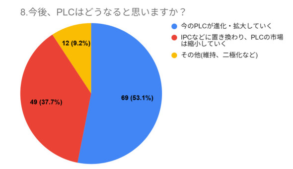 最後の「今後、PLCはどうなると思いますか?」(図7)という問いには、「今のPLCが進化・拡大する」(53.1%)が、「IPC(産業用PC)などに置き換わり縮小する」(37.7%)を上回りました。現場はPLCの“衰退”ではなく、“進化”を信じていることが伺えます。