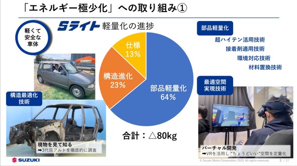 車体の軽量化に関しては、「アルト」の次期モデルで2021年発表の9代目アルトから空車重量で100kgの軽量化を目指すとしていた。9代目アルトの空車重量は680kgだ。初代や3代目など過去のアルトを研究し、四輪車だけでなく二輪車や船外機など部門を超えてアイデアを出し合いながら、80kgの軽量化案にめどをつけた。部品の軽量化で50kg、構造の進化で20kg、仕様の見直しで10kgを削減した。