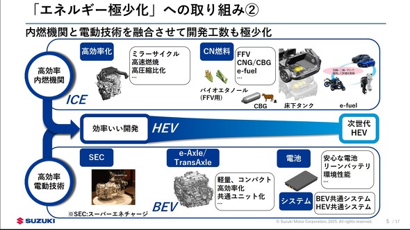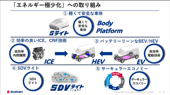 2024年に発表した技術戦略では「エネルギー極少化」をテーマに、「軽くて安全な車体」「内燃機関の高効率化」「必要最小限の電池容量による電動化」「必要十分な機能によるSDV」「サーキュラーエコノミー」に取り組むと説明した。今回の技術戦略2025では、これらの取り組みの進捗状況が説明された。