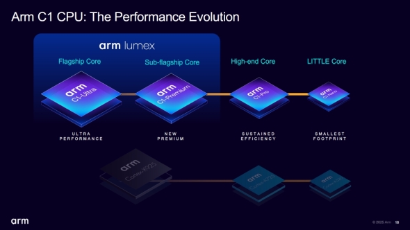 これまでArmが展開してきたCPUの「Cortex-Aシリーズ」は、高性能コアと省電力コアを組み合わせるbig.LITTLE構成を基軸としており、CSS for Clientでは高性能コアが「Cortex-A725」、省電力コアが「Cortex-A520」だった。Lumex CSSにおいて、Cortex-A725の後継がC1-Pro、Cortex-A520の後継がC1-Nanoとなる。ただし、プロセッサIPセットとしてLumexの名称を使うには、C1-UltraとC1-Premiumという2つのフラグシップCPUを採用する必要がある。