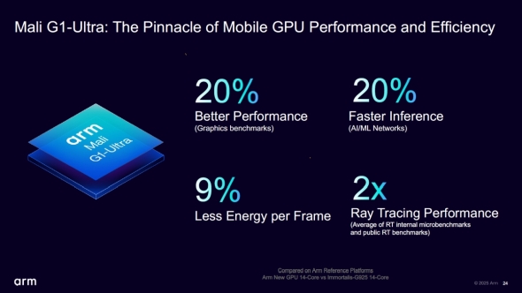 Mali G1-Ultraは、CSS for Clientの「Immortalis-G925」と比べてグラフィックス処理性能とAI処理性能が20%向上し、フレーム当たりの消費電力を9%削減した。また、新たなレイトレーシングユニットの採用によりレイトレーシング性能は同2倍に向上している。