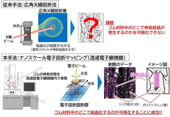 今回の研究では、試料を引っ張りながらnmサイズの電子ビームを走査できる先端技術を応用し、従来の広角X線回折法では困難だった、ポリイソプレンゴムの伸長結晶化が起こる位置の可視化に成功した。タイヤ材料として使用されるシリカ配合ポリイソプレンゴムでは、シリカ粒子の凝集塊が伸長方向に配列し、その配列構造に沿った伸長結晶化を示すことが分かった。
