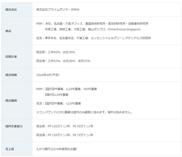 三井化学、出光興産、住友化学は2025年9月10日、三井化学と出光興産の合弁会社であるプライムポリマー(以下、PRM)が行うポリオレフィン(PO)事業と、住友化学の国内のポリプロピレン(PP)事業および直鎖状低密度ポリエチレン(LLDPE)事業を統合することで基本合意したと発表した。
