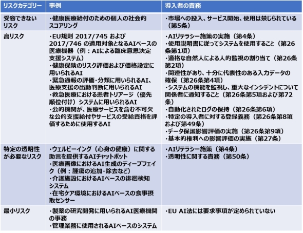 表1は、これらのうちAI法に関連して医療分野のAIシステム向け要求事項を整理したものである。