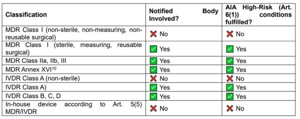 参考までに表2は、AI法第6条第1項のMDR/IVDRへの適用に関する医療機器分類別の一覧表である(一部例外あり)。