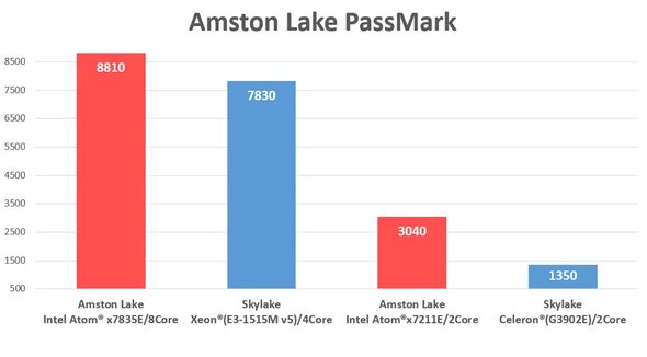 AX-1130が搭載するAmston Lakeは、最大8つのEコア構成で、最大32基の実行ユニットを備えるGPU「Intel UHD Graphics」を内蔵している。PassMarkの性能テストでは、総合平均でSkylake世代のCeleronを最大125%上回り、一部ベンチマークでは上位クラスと遜色のない性能を示した。