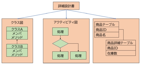 図2は、詳細設計書の成果物の例です。クラス図、モジュール構造図、データベースの構成を定義します(各ドキュメントの意味や詳細は、あらためて解説します)。ただし、詳細設計書は開発者向けのドキュメントなので、発注側の担当者では理解が難しい場合があります。その場合は、レビューで補足説明を行うとよいでしょう。